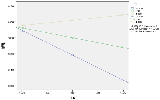 In addition to the hypothesized relationships, we tested the conditional indirect effect in the presence of a first-stage moderator. Table 5 shows that the magnitude of the indirect effect of TS on EP through QWL (−0.0468) is strongest and negative when OF is low. The results of the moderated mediation analysis show that the conditional direct effect of TS at different values of OF is insignificant. In contrast, the conditional indirect effects of TS on EP through QWL in the presence of OF are significantly negative at low values of OF and become insignificant at high values of OF. The index of moderated mediation is also significant, and there is no zero in the CI (Index: −0.0261; CI: 0.037; 0.065), indicating that the proposed model is a moderated mediation model.