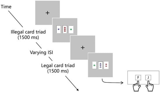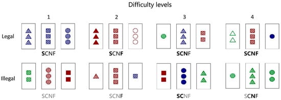 We adapted the implicit–intentional learning task from Beston et al. [10] as the stimulus because this task both assessed the overall performance of implicit rule learning and allowed us to explore the role of social feedback at different difficulty levels. The stimulus for the implicit–intentional learning task included different combinations of card triads (i.e., three cards in each trial). The figures in each card contained four dimensions: shape (S: circle, square, and triangle), color (C: red, green, and blue), number (N: one, two, and three), and filling (F: empty, hashed, and full). Based on the combination of the four dimensions, a total of eighty-one cards were created which then composed the different card triads. If the elements of each dimension (S, C, N, and F) of all the cards were the same or different in a card triad, the triad of cards was considered to be a legal card triad complying with the implicit rule. In other words, a card triad would be illegal if any dimension of the three cards was not completely identical or different. Moreover, considering that different difficulties caused by the complex change of card triads could affect the process of implicit learning, the card triads were divided into four difficulty levels. The creation of the card triads and the randomization of trials in each difficulty level were implemented entirely by programming with E-Prime 2.0. Examples of legal and illegal card triads with different difficulty levels are presented in Figure 1.