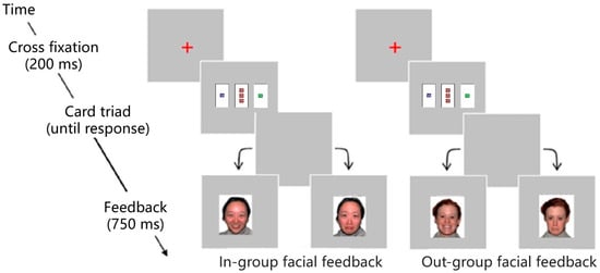 Facial expression is one of the common types of social feedback that can signal a correct or incorrect answer with a smile or frown [10,17,18,19,20]. According to the group members’ information, facial expression feedback can be divided into two types: in-group facial feedback and out-group facial feedback. In-group facial feedback refers to the facial expression of individuals within the same ethnic group as the observer. Out-group facial feedback refers to the facial expression of individuals from different ethnic groups than the observer. For example, for Chinese people, the feedback from East Asian faces could be in-group facial feedback, and western individuals’ facial expressions could be out-group facial feedback.