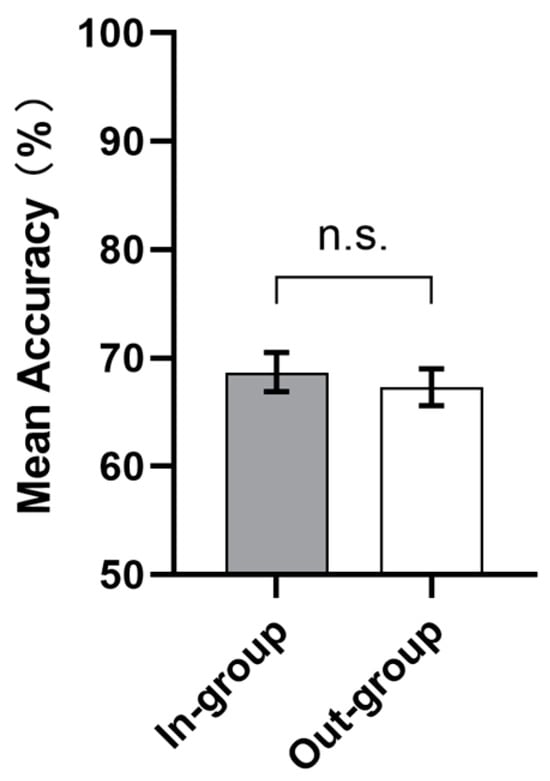 The results from the test phase of Experiment 1 showed that there was no significant difference between the in-group and out-group facial feedback conditions in terms of accuracy. Error bars represent the standard error of the mean accuracy. n.s. p ≥ 0.1.