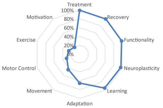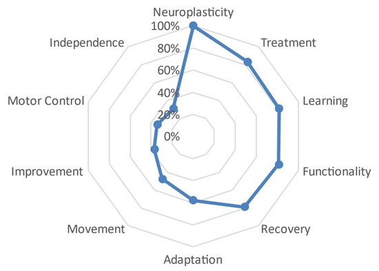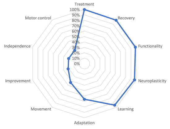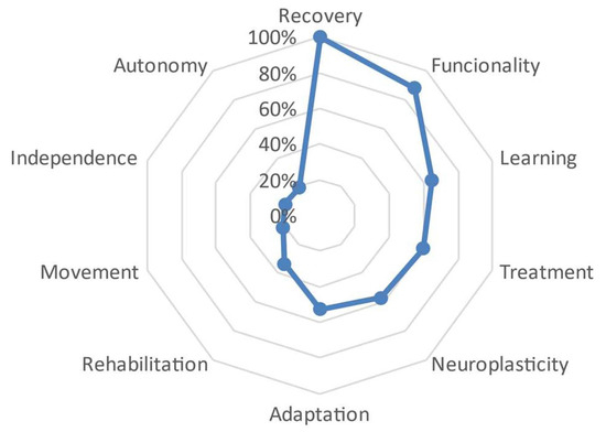 As highlighted in Figure 1, from the total number of obtained words it is possible to identify several defining words that carry a stronger semantic weight for the neurorehabilitation concept. The general semantic core was primarily composed of the word ‘treatment’ (SAM = 486), followed by ‘recovery’ (SAM = 482), ‘functionality’ (SAM = 479), ‘neuroplasticity’ (SAM = 471), ‘learning’ (SAM = 461), and finally, ‘adaptation’ (SAM = 320). Accompanying this set are the words ‘movement’ (SAM = 210), ‘improvement’ (SAM = 153), ‘independence’ (SAM = 148), and ‘motor control’ (SAM = 148) with lower frequencies than the first ones mentioned. Table 1 provides a detailed frequency analysis of each defining word in the general semantic network, as well as the frequency of the distance between one word and another.