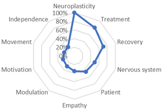 The Spanish physiotherapists interviewed used a total of 1247 defining words for the concept of neurorehabilitation. The semantic core of the concept was mainly formed by the words ‘treatment’, ‘recovery’, ‘functionality’, ‘neuroplasticity’, and ‘learning’, which had significant importance.