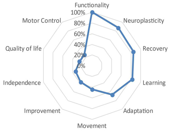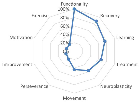 For the master degree group, the central defining word was ‘functionality,’ which showed a slight distance from words such as ‘neuroplasticity,’ ‘recovery,’ and ‘learning,’ which were around 80%. The distance became more evident starting from the word ‘adaptation’ at 67%, and then there was a more abrupt tendency towards 0, ranging from 44% with the word ‘movement’ to words like ‘motor control’ and ‘quality of life,’ which were around 25% to 26%, respectively. These latter words alluded to a biological dimension but were not solely limited to their biological nature. See Figure 7.