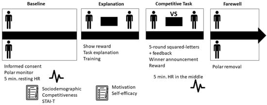 The experimental sessions were carried out between 16:00 and 20:00 in order to control circadian rhythms in cardiovascular activity. Two people of the same sex participated in each experimental session. When participants arrived at the laboratory, they were each seated in a separate individual room where they received information about the experimental procedure and signed an informed consent form. Subsequently, the experimenter instructed participants to adjust the Polar monitor for the HR registration, and s/he asked the participants to remain seated and relaxed for the next 10 min. The last five minutes of this period were used as the basal measure of HR. Next, the researcher provided a series of trait questionnaires (competitiveness and trait anxiety) and sociodemographic information and instructed the participants to complete them. Once both participants had finished the questionnaires, they were moved to a common room where they sat face-to-face at the same table. At this time, the researcher communicated to the participants that they were going to compete for an economic prize; s/he explained the task and gave participants a small sample of the task so that they could become familiar with it. After this training and before the competition, the participants answered some questions about self-efficacy and motivation. Afterward, they carried out the competition, which lasted about 20 min (5 rounds of 2.5 min plus the correction time and feedback between the rounds). The central 5 min of the competition period was used to obtain the competition measurement of HR. At the end of the competition, the experimenter announced the winner and rewarded him/her with the prize. After announcing the winner, participants were instructed to return to their individual rooms and remove the Polar monitor (Figure 1).