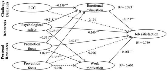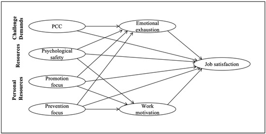 Finally, considering that personal resources have a similar effect as job resources in the JD–R model [61], we propose that the effect of personal resources (i.e., promotion and prevention focus) may be mediated by emotional exhaustion and work motivation. According to a recent review, individuals with positive personal resources have been found to have a strong connection with work engagement and are less susceptible to burnout. These individuals are characterized by their openness, warmth, supportiveness, and perseverance. However, individuals with negative personal resources are more prone to experiencing burnout. This can be attributed to their inclination to focus on the negative aspects of a situation and their tendency to remember negative information about the situation afterward. This negative cognitive bias can contribute to a heightened sense of exhaustion, cynicism, and inefficacy, ultimately leading to burnout [24]. In accordance with the JD–R model, this study aimed to examine the potential indirect association between challenge job demands (PCC), job resources (psychological safety), and personal resources (promotion and prevention focus) with job satisfaction, mediated by emotional exhaustion and work motivation.