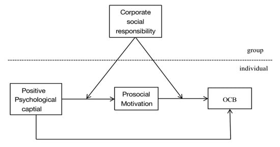 CSR refers to all prosocial organizational activities and outcomes not pursuing profit maximization []. Werther and Chandler [] defined CSR as internal CSR and external CSR based on stakeholder perspectives. External CSR focuses on the local community (e.g., charitable donations, community development investment), the environment (e.g., environmental protection investment, pollution prevention), and consumers (i.e., responsibility to consumers of company products or services) []. Internal CSR focuses on internal resources (i.e., employees). Most of the previous studies focused on external CSR, paying attention to financial performance and marketing effects. However, employees are also essential stakeholders of CSR because they are influenced by and impact their employer’s CSR actions []. Recent studies have begun to examine the psychology of CSR, focusing on how employees perceive and respond to CSR []. When an organization fulfills its social responsibilities, such as protecting the environment, actively participating in donation activities, taking care of people in need, etc., employees will feel that the organization is responsible and trustworthy, so they will feel psychologically safer to allocate their resources and energy to the organization. Therefore, we believe that employees with positive psychological capital will be more willing to show prosocial motivations when organizations perform CSR.