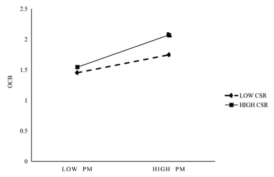 Shao et al. [] found that when employees perceive CSR as high rather than low, the positive relationship between employees’ prosocial motivation and organizational commitment will be stronger. Employees with prosocial motivation establish a high degree of identity in organizations that value CSR, and they will be more engaged in off-role actions [,]. Kim and Kim [] indicated that employees with highly prosocial motivations may want to contribute to others, so they may think that the organizations’ ethical practices are closely related to the values that they pursue. Then, they will actively respond to CSR activities through prosocial action (OCB) in the organization.