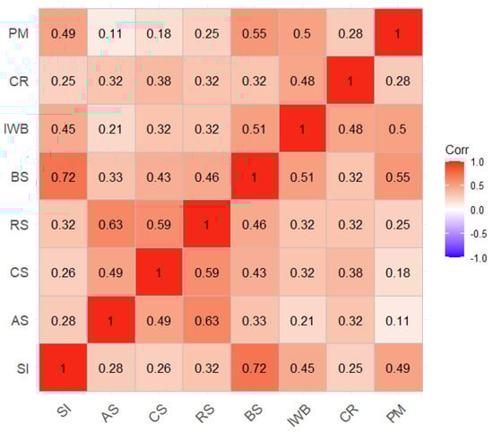 Correlogram (Pearson correlations) of the study variables. Note: all correlations are significantly different from 0. SI = social impact; AS = autonomy satisfaction; CS = competence satisfaction; RS = relatedness satisfaction; BS = benevolence satisfaction; IWB = innovative work behavior; CR = creativity; PM = prosocial motivation.
