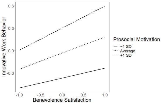 Moving on to the moderation of benevolence satisfaction on work outcomes by prosocial motivation, it is important to note that prosocial motivation shows a positive association with both work outcomes (innovative work behavior and creativity). However, the moderating role of prosocial motivation in the effects of need satisfaction on work outcomes is limited, as evidenced by non-significant interaction terms for most cases (all p-values for interaction terms >0.186). However, a notable exception is observed in the case of the effect of benevolence satisfaction on innovative work behavior. The relationship between benevolence satisfaction and innovative work behavior becomes stronger (more positively pronounced) as prosocial motivation increases (Figure 3). Specifically, as depicted in Figure 2, when prosocial motivation is 1 standard deviation below the mean, the effect of benevolence satisfaction on innovative work behavior is moderate (β = 0.131, SE = 0.054, z = 2.45, p = 0.014). At average levels of prosocial motivation, this effect becomes more pronounced (β = 0.213, SE = 0.049, z = 4.35, p < 0.001). Moreover, when prosocial motivation is 1 standard deviation above the mean, the effect is even stronger (β = 0.295, SE = 0.054, z = 5.52, p < 0.001).