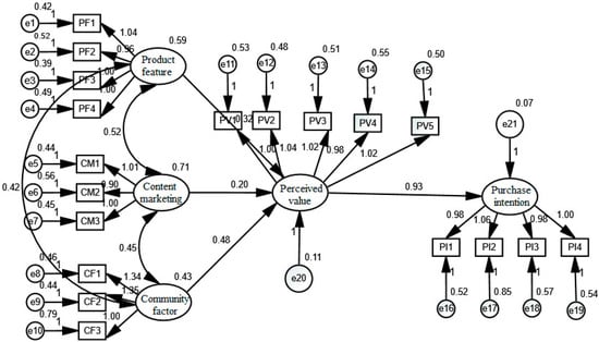 As can be concluded from Figure 3, product characteristics, content marketing, and community factors boost markedly consumer perceived-value and the perceived value, in turn, spurs consumers’ purchase intentions, which is consistent with the above research hypotheses. Through the test of modeling the path coefficient, the degree of positive influence is obtained, as shown in the following table: