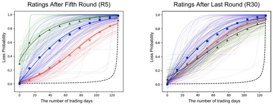 Fitted risk probability rating curves after the fifth round (R5) and fitted risk probability rating curves after the last round (R30). Note: The two panels showed the fitted risk probability rating functions for each participant’s probability ratings (light colored) based on the mean values for 11 estimates of the risk of continuing to hold stocks in the next trading day. R5 represents the fitted risk probability curves after participants completed the first five rounds of the SIT, and R30 after participants completed all rounds of the SIT. The three different colors of fitted risk probability rating functions in R5 and R30 represent three different initial investment experiences: The green curve (triangles) represents the HIE; the blue curve (square) represents the CIE; the red curve (exes) represents the LIE. The black dashed curve is the objective probability of the loss set by the experimenter based on Equation (1).