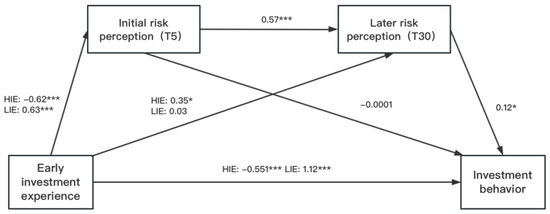 The chain-mediating role of initial risk perception and later risk perception between investment experience and investment decision and behavior. Notes: HIE, High-risk investment experience; LIE, Low-risk investment experience. * p < 0.1, *** p < 0.001. Coefficients in the Figure 2 are partially standardized because of the multicategory indicators of early investment experience.