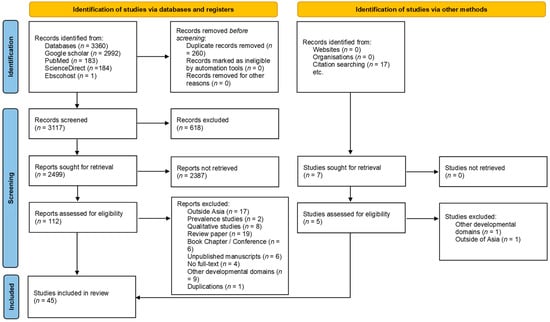 The initial search yielded 3377 records in total, with 3360 records found from the four electronic search databases (2992 from Google Scholar, 183 from PubMed, 184 from ScienceDirect, and one from Ebscohost), and 17 studies found by reviewing the reference lists and citation searching. There were 3117 records after the duplicates were removed. Following screening of the titles and abstracts, 117 studies were selected for further evaluation. After further review and application of the selection criteria, 45 studies were selected for inclusion in this review. A PRISMA flow diagram is prepared to illustrate the study selection process (see Figure 1).