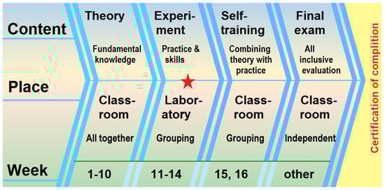 The course of “Advanced Methods of Materials Characterization” is composed of three associated sections (Figure 1): theoretical learning in the classroom from the first week to the tenth week; eight characterization experiments in the laboratory for practices between the 11th and 14th weeks; and self-training for applying knowledge and training the capability of combining theory with practice. In the final examination for the certification of completion, 18 of the 100 points in the test are allocated to examination questions about safety issues. The laboratory behaviors of all the students can be reflected from the answers quantitatively.