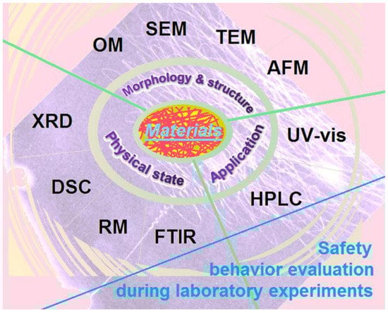 These characterization methods can be divided into three groups. One group is to “see” things at the micro level, mainly morphology, shapes, and inner structures. These methods include optical microscopy (OM) [,,], scanning electron microscopy (SEM) [,,,,], and transmission electron microscopy (TEM) [,,,,]. The second group is to evaluate the physical state of the components and their compatibility, through experimental methods, including roman spectroscopy (RM) [], Fourier-transform infrared (FTIR) [,,,,], differential scanning calorimetry (DSC) [,,], and X-ray diffraction (XRD) [,,]. The third group is an experiment about quantitative measurement, i.e., ultraviolet-visible spectroscopy (UV-vis) [,]. As shown in the references [,,,,,,,,,,,,,,,,,,,,,,,,,,], these experimental methods are frequently and intensively exploited in scientific studies to evaluate composites and nanomaterials [,]. They are very useful for undergraduate students in terms of grasping fundamental knowledge and professional skills, and fostering the ability of working and innovation in their coming careers.