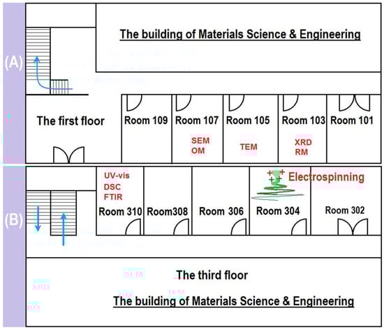 - In the experimental lessons, we conducted eight experiments in different rooms. These experiments include: OM, SEM, TEM, RM, and XRD (Figure 3A); FTIR, DSC, UV-vis, and electrospinning preparation (FTIR was directly given in the blank) (Figure 3B). Fill the experiments in their located rooms, where they were carried out (7 points).Figure 3. The places for carrying out the 8 characterization experiments and the preparation of drug-loaded nanofibers: (A) the first floor of the Materials Building in University of Shanghai for Science and Technology; (B) the third floor of the Materials Building (the answers are written in the blank).