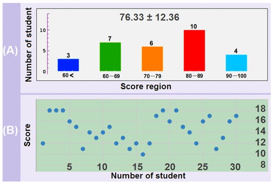 As for the safety issue questions, the scores are between 10 and 18 points, with five students obtaining the full 18 points. The scattering plot of these scores is drawn in Figure 4B. Several students lost their scores in the second sub-question due to grammar mistakes for professional words. The main differences are from the students’ behaviors about the first and third sub-questions.