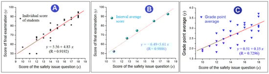 To analyze the relationship between the scores of safety questions and whole final examination, two methods are conducted. One is from all the individual students, and the other is from the interval average score. Their results are shown in Figure 5A,B, respectively.