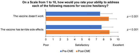 Self-reported rating on a scale of 1–10 of general practitioners’ (n = 159) confidence in their ability to address potential reasons for influenza vaccine hesitancy by patients before and after participating in an accredited continuing medical education (CME) program.