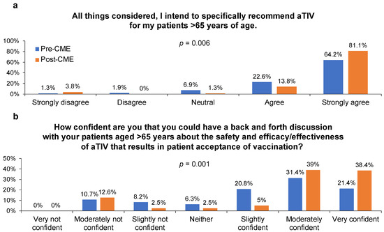 General practitioners’ (n = 159) (a) self-reported intention to recommend vaccination with adjuvanted trivalent influenza vaccine (aTIV) for their patients aged ≥65 years before and after participating in an accredited continuing medical education (CME) program and (b) confidence in their ability to convince patients to accept vaccination with aTIV.