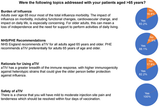 GPs who participated in the patient portion of the study (n = 12) reported presumptively recommending aTIV to 116 of 185 patients (62.7%) and not recommending aTIV to 53 patients (28.6%; Table S1). In the majority of patient interactions, GPs reported providing information about the burden of influenza, Public Health England (PHE) recommendations for influenza vaccination, the rationale for using aTIV to help older patients mount a stronger immune response to influenza, and the expected side effects of influenza vaccines (Figure 4).