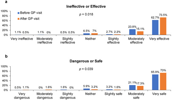 Prior to seeing their GP, 86.4% of 185 patients indicated they planned to be vaccinated against influenza during the 2018–2019 season. Most patients—85.4% before the GP visit and 87.6% afterwards (p = 0.101)—also reported that people important to them wanted them to be vaccinated against influenza. A large majority of patients expressed the perception that influenza vaccination was good, wise, effective, safe, and important both before and after the visit with their GP (Figure 5 and Figure S4). However, statistically significant shifts toward more positive perceptions about the effectiveness and safety of influenza vaccines occurred after the GP visit (Figure 5).