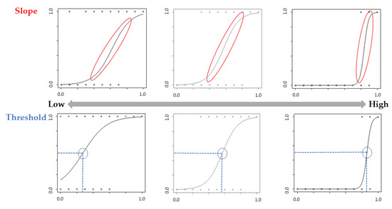 Image of the slope and threshold. A high positive slope indicates that the participants were judged as having their own movement, whereas a low slope indicates that participants ambiguously judged the movement as their own. A high threshold value indicates that they did not judge the movement as their own unless it reflected more of their own movement, whereas a low threshold value indicates that the movement was judged as one’s own, even if it did not reflect one’s own movement significantly.
