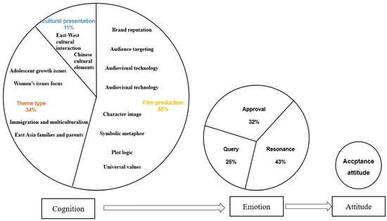 Based on the results of the cognitive–emotional–attitudinal relationship formed by the selective coding, we further clarified the mechanism model affecting the formation process of viewers’ receptive attitude behavior, as shown in Figure 1. It visually shows the proportion of viewers corresponding to the discussion part, and can also better explain how it affects the final acceptance attitude of viewers. We can discuss the core categories in this diagram in four dimensions.