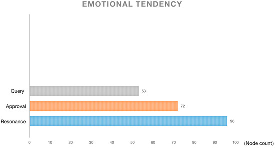The emotional tendency dimension is shown in Figure 5. It can be seen that the main emotion of the audience is resonance, followed by identification and, finally, questioning. The majority of the resonance is due to the audience’s self-projection. That is, when seeing the behavior and situation of the characters in the film, they will unconsciously project themselves into the situation as well [65]. Movies, like books, can enhance one’s mental capacity to understand others better [66]. Many comments from the audience indicated that they saw themselves in Meimei, so it was very easy to empathize with the characters in the film, and thus, resonate with them. As the child, she is the submissive one in the parent–child relationship. As a woman, she hides her true self under social rules. As a teenager, she needs friends and socialization to connect with society while growing up. Meanwhile, as a descendant of immigrants, she must struggle to find an identity in multiple cultures. This makes the audience able to identify with her and find similar life experiences. This cultural identity is more likely to appeal to a global audience than the emphasis on cultural hybridity would [67].