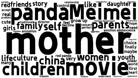 What is of concern is that this attitude of acceptance is not rooted in how skillfully the film balances East and West, or how East–West cultural hybridity achieves equality in the true sense of interaction. Rather, the film inspires individual, not collective, emotion in the audience. Turning Red achieves cultural identity, not a collective national cultural identity, but rather an identity about individual growth experiences. This we can verify with the help of the high-frequency word cloud in the original text. The results of high frequency words are shown in Figure 7. It can be seen that the audience’s discussion focused on the parent–child relationship issues directed by “mother”, “child”, “family”, and “parents”, followed by the attention to adolescents and women, and the culturally related issues came even later. Compared with cultural values, it is easier for personal real growth experience to obtain cross-cultural resonance. Cultural heterogeneity reflects the degree to which a film represents a particular culture [68]. Although this film has a regional cultural representation, it is not culturally heterogeneous, and thus, has attracted a wide audience.