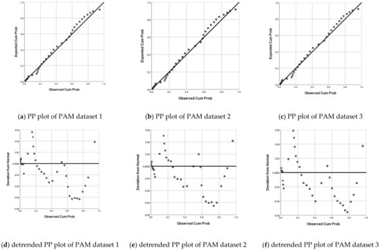 First, two trained coders entered and cross checked the data for the EFA, CFA1, and CFA2 subgroups together, and no univariate outliers were detected. Second, the probability–probability plot (PP Plot) was used to test whether the samples conformed to a normal distribution. The PP plot is a graph based on the relationship between the cumulative proportion of variables and the cumulative proportion of the specified distribution [,]. The PP plot allows researchers to check whether the data conform to the specified distribution. When the data obey the assumed distribution, the points corresponding to each data point are approximately distributed in a straight line at the right diagonal position in the graph [,]. The detrended PP plot is a supplement to the PP plot test, and the data can be considered to obey the distribution under test when the distribution of the data under test is around the 0 scale [].