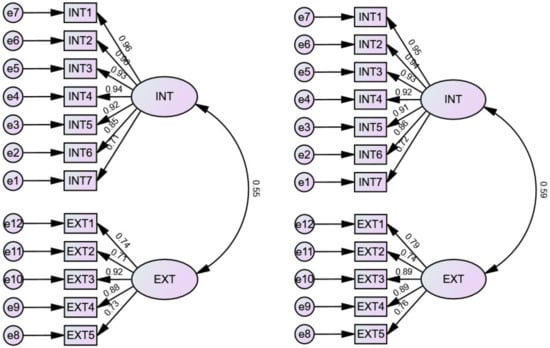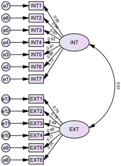 The different measurement models were further tested by validated factor analysis on different subsamples. Based on EFA and the literature on teacher accountability [], three measurement models were tested for the adaptation of the PAM-Ch. Model 1 was a one-dimensional, one-factor model [] with 13 question items tested in the CFA1 (n = 359) subsample. Model 2 was a first-order, two-dimensional, two-factor model [], with 13 question items tested in the CFA2 subsample (n = 381). Model 3 was a first-order, two-dimensional, two-factor model based on EFA proposed with 12 question items, where EXT6 was removed. Model 3 was tested in the CFA1 (Model 3a) and CFA2 (Model 3b) subsamples.