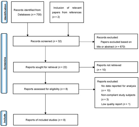 We selected 700 articles through an initial search on the database. In the first round of screening, we read the titles and abstracts and excluded 670 articles not related to the literature review and the research topic. In the second round of screening, we additionally excluded studies in which the full text was not available (n = 10), studies with ineligible subjects (n = 3), studies not clearly providing outcome data (n = 10), and studies of poor quality (n = 1). From the references of previous studies, we selected two additional articles that met our selection criteria. Finally, eight articles that met all inclusion criteria were included in the analysis (Figure 1).