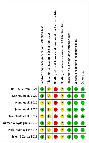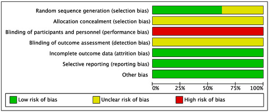 - Higgins, J.P.; Altman, D.G.; Gøtzsche, P.C.; Jüni, P.; Moher, D.; Oxman, A.D.; Savovic, J.; Schulz, K.F.; Weeks, L.; Sterne, J.A. The Cochrane Collaboration’s tool for assessing risk of bias in randomised trials. BMJ 2011, 343, d5928. [Google Scholar] [CrossRef]
