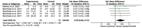 Sport-specific power. The results of the meta-analysis determining core training effectiveness on the sport-specific performance of athletes showed that core training generated a small effect size in power compared to the control group (SMD = 0.39; 95% CI: 0.06–0.72; I2 = 0%; p = 0.02); see Figure 5.