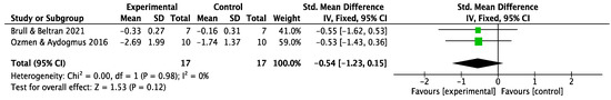 Sport-specific agility. We conducted a meta-analysis to determine the effectiveness of core training on the athletic performance of athletes (see Figure 7). The results showed that core training determined a medium effect size in agility (e.g., Illinois agility test) compared to the control group (SMD = −0.54; 95% CI: −1.23–0.15; I2 = 0%; p = 0.12).