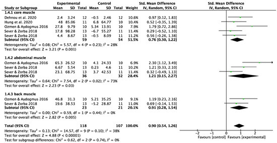 The meta-analysis results in Figure 8 showed that core training had a large effect size in core endurance compared to the control group (SMD = 0.90; 95% CI: 0.54–1.26; I2 = 38%; p < 0.00001). A subgroup analysis showed a medium effect size in anterior abdominal endurance (plank time; SMD = 0.76, 95% CI: 0.30–1.22, I2 = 28%, p = 0.001), and a large effect size in lateral abdominal endurance (side plank time; SMD = 1.21, 95% CI: 0.15–2.27, I2 = 73%, p = 0.03) and posterior back endurance (bridge time; SMD = 0.91; 95% CI: 0.28–1.54; I2 = 0%; p = 0.005). A high level of heterogeneity was found in the lateral abdominal muscles. To resolve this, a sensitivity analysis was conducted from which the data provided by Ozmen and Aydogmus [29], which was presumed to be the main cause of heterogeneity, was excluded. Consequently, the statistical significance changed (SMD = 0.75; 95% CI: −0.12–1.62; I2 = 53%; p = 0.09).