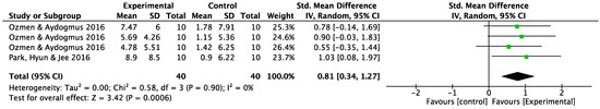 The results in Figure 9 show that core training had a large effect size on balance, as opposed to the control group (SMD = 0.81; 95% CI: 0.34–1.27; I2 = 0%; p = 0.0006).