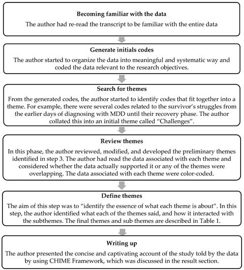 The interviews were ended once the data were adequate, and no new themes emerged. The recordings were then transcribed into verbatim text and the researcher identified questions that contained sensitive elements so that the same questions would not be repeated in the next interviews. The transcribed data were analyzed by using the six steps of thematic approach described by Braun and Clarke [23] (see Figure 1). The six steps are as follows (done by the first author):