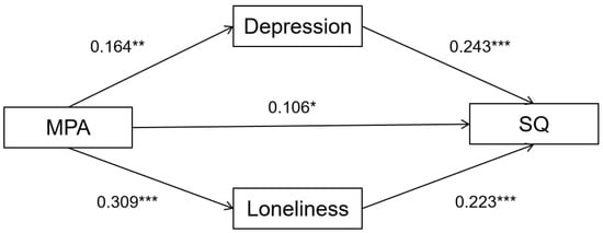 Model with Depression and Loneliness as mediators in the relation of mobile phone addiction (MPA) with sleep quality (AQ). * p < 0.05; ** p < 0.01; *** p < 0.001.