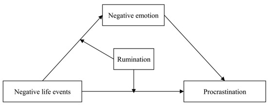 Previous research has examined the influencing factors of procrastination from various perspectives, such as parenting patterns [8], negative emotions [9], attention control [10], self-worth [8], maladaptive behavior [1] and personality traits [11,12]. Although previous studies have revealed the influencing factors of procrastination from the different perspectives mentioned above, few studies have explored the effects of the combination of these factors on procrastination. Given that procrastination is associated with various factors, procrastination may also be associated with a combination of factors. Therefore, to further understand the causes of individuals’ procrastination, researchers should consider environmental factors (e.g., negative life events), individual emotional factors (e.g., negative emotions) and personality factors (e.g., rumination) in a relatively comprehensive model.