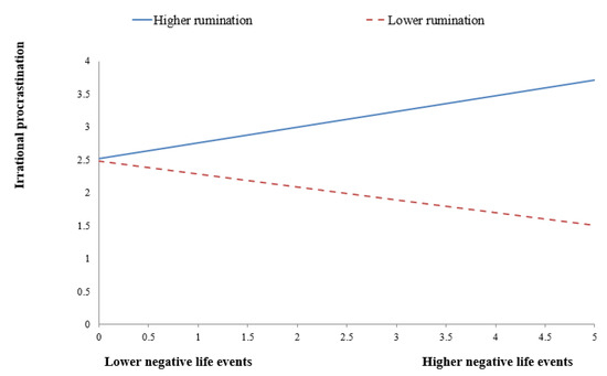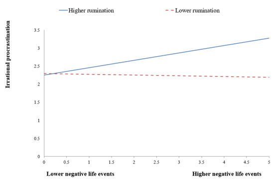 Empirical studies have demonstrated that rumination could moderate the effects of negative life events on internalizing or externalizing problems. For instance, Kraaij et al. [13] showed that the effect of negative life events on depressive symptoms was stronger for those who used ruminative style to a higher extent than those who did not. Although empirical research has not revealed a moderating effect of rumination on the link between negative life events and procrastination, rumination has shown positive and significant correlation with procrastination [44]. Previous studies have also indicated that individuals with higher rumination tend to have lower self-control and self-regulation [45]. Procrastination has been considered a self-regulation deficit manifesting itself in problems of self-regulation [3]. Therefore, it is reasonable to assume that adolescents with higher rumination may have more procrastination when suffering from negative life events.