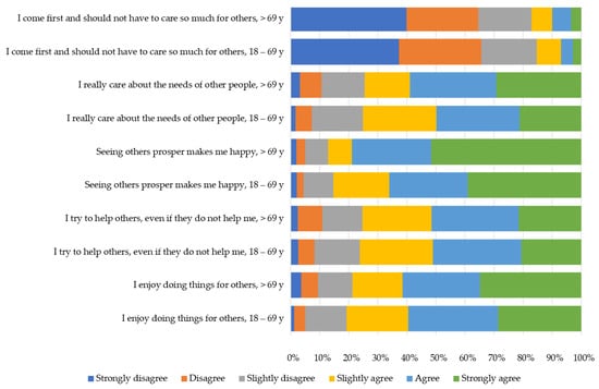 Differences in response patterns to single items of the altruism scoring system by survey participant age groups 18–69 years (n = 1169) and 70 years and above (n = 257), respectively. Abbreviation: y, years.