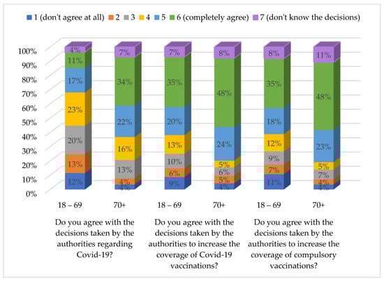 Responses to survey items regarding agreement with the decisions taken by the authorities concerning COVID-19 and vaccinations by age groups 18 to 69 years (18–69) and 70 years and above (70+).