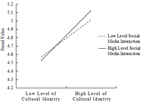 The moderating effect of different social media interaction levels on the relationship between cultural identity and brand value.