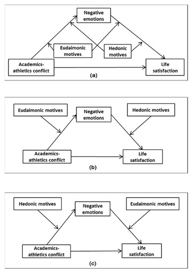 Eudaimonic and hedonic motives moderate the mediating path of academics–athletics conflict affecting college athletes’ life satisfaction through negative emotions. The three possibilities included in this hypothesis are shown in (a), (b), and (c) in Figure 1, respectively. (a) Eudaimonic and hedonic motives simultaneously moderate the first and second halves of the mediation path. (b) Eudaimonic motives moderate the first half of the mediation path, while hedonic motives moderate the second half. (c) Hedonic motives moderate the first half of the mediation path, while eudaimonic motives moderate the second half.