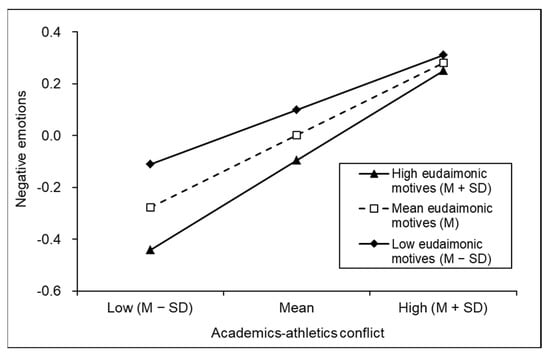 The results of the moderating effect of eudaimonic motives are shown in Figure 3. At the high (M + SD), medium (M) and low (M − SD) levels of eudaimonic motives, the positive effect of academics–athletics conflict on negative emotions was significant (simple slope high = 0.35, t = 8.05, p < 0.001; simple slope medium = 0.28, t = 8.26, p < 0.001; simple slope low = 0.21, t = 4.55, p < 0.001). The effect of academics–athletics conflict on negative emotions was stronger in the condition of high eudaimonic motives. The moderating effect of eudaimonic motives was more pronounced when academics–athletics conflict was below the medium level (M or M − SD).