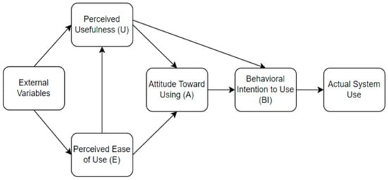 In addition to the two main variables above, TAM is often accompanied by external factors that explain variations in ease of use and perceived usefulness []. Some of the most widely used external variables in the research are self-efficacy, subjective norm, enjoyment, computer anxiety, and experience []. The TAM model can be seen in Figure 1 below.