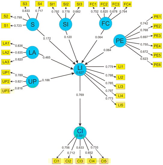 The reliable questionnaire is shown with the value of the Cronbach’s alpha formula over 0.70 (Hair, Hult, Ringle and Sarstedt, 2017) []. On the other hand, the six hypotheses will be tested by measuring the path coefficient and the T-statistic. The path coefficient value describes the relationship path between one variable and another, and it has a range value between −1 and 1. Meanwhile, the T-statistic is used to determine if there is a significant difference between the means of two groups, which may be related to certain features. If the t-statistic value is >1.65, there is a significant relationship between those two groups. However, if the value is <1.65, there is no significant relationship between the groups.