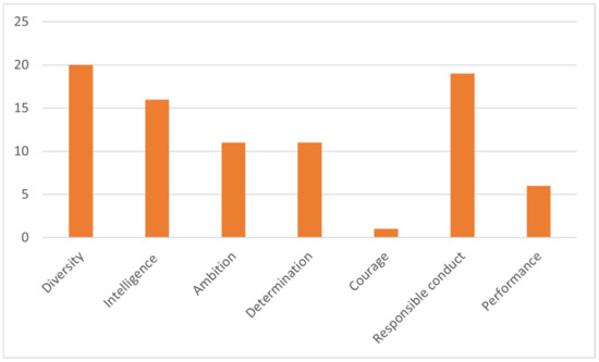 Athletes who manage to be successful in a competitive activity and at the same time are aware of the importance of a broad approach to their training present a series of clearly defined characteristics in the answers obtained. The dominant trait, in the view of the respondents, is intelligence, followed by ambition and determination (Figure 2, attributes that are essential for a champion profile).